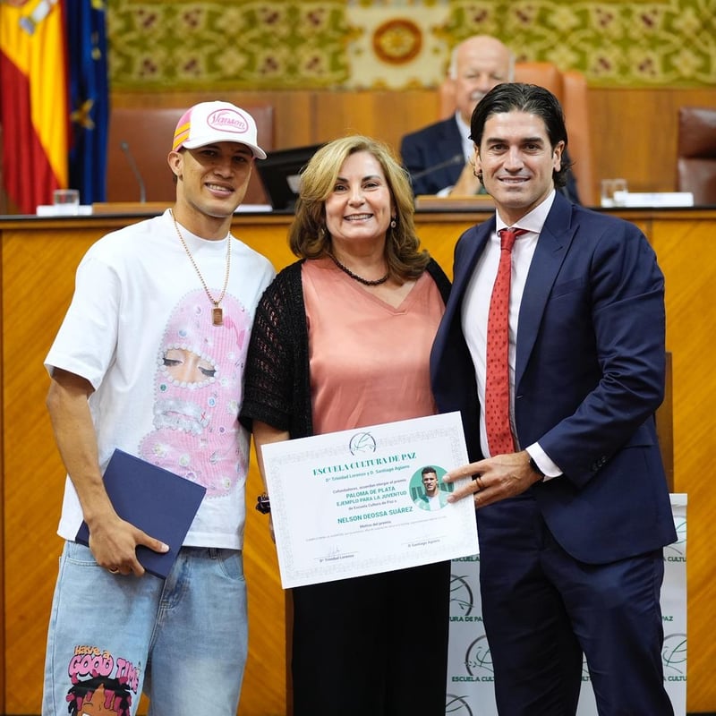 Los jugadores del Real Betis Antony Matheus dos Santos y Nelson Deossa han sido distinguidos este viernes 7 de noviembre de 2025 en el Parlamento de Andalucía con la Paloma de Plata que otorga cada año la Escuela Cultura de Paz, importante organización sevillana sin ánimo de lucro que se involucra en numerosos proyectos de cooperación con el desarrollo y que se ha erigido en órgano consultivo de la ONU en materias de mujer y juventud. Los galardones al extremo brasileño y el mediocentro colombiano, que participan en numerosas campañas solidarias y formativas, se integran en las Jornadas de Educación en Valores, premiando el ejemplo para las nuevas generaciones que suponen ambos en el ejercicio de su trabajo. Como en 2023 con el delantero entonces verdiblanco Borja Iglesias, se reconoce el compromiso de los dos suramericanos dentro del deporte y de otros con la música, por ejemplo, con todo tipo de causas en favor de los más necesitados o labores de voluntariado.