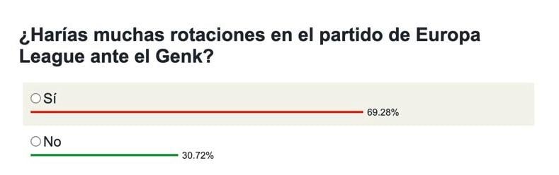 En ESTADIO, hemos querido preguntar a la afición del Betis si harían muchas rotaciones en el once titular o sólo plantearían algunos cambios. La respuesta del beticismo ha sido contundente y en la misma línea de pensamiento que su entrenador. El 69,28% de los votantes han elegido la opción de las rotaciones masivas para el choque europeo ante el Genk, mientras que el 30,72% restante no se volverían locos con tantos cambios e irían con un once más habitual al choque. Pellegrini ya no sólo convence a la afición con sus actuaciones, sino que ha conseguido que los hinchas vayan en la misma línea de pensamiento que él mismo.