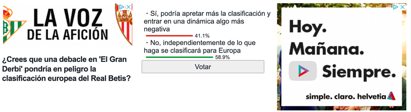 Según los datos obtenidos a través de la Encuesta Helvetia de ESTADIO Deportivo, la afición cree que independientemente de lo que pase este domingo, el Betis se clasificará para Europa. Así lo demuestran casi el 60% de los votos. Este año todo parece apuntar que el equipo de Manuel Pellegrini tiene prácticamente asegurada una plaza en Europa, aunque todavía queda mucha temporada por delante.