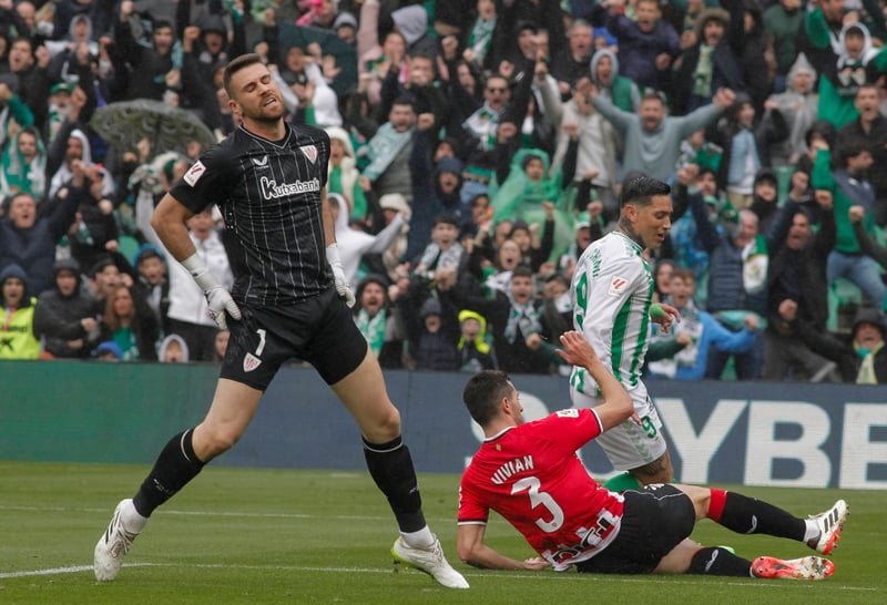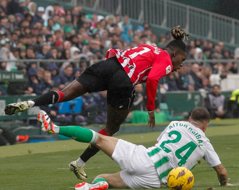El '24', que continuó en el lateral derecho pese al buen nivel anterior de Héctor Bellerín, suplente también en tierras croatas, desplazó a Youssouf Sabaly a la banda izquierda, con la encomienda ambos de aprovechar su velocidad para contener a Nico Williams y Álex Berenguer, respectivamente. Lo hicieron a la perfección, sumándose, además, muy bien al ataque cuando tocaba. Aitor desesperó completamente al menor de la saga vasco-ghanesa, que no se le fue nunca y que terminó expulsado al protestar una falta clara a Nabil Fekir (aunque venía enfadado al no señalársele una previa al 2-0 de Germán Pezzella) y luego aplaudir a Cuadra Fernández, que castigó su desconsideración con la segunda amarilla. Pero Ruibal no pudo rematar su domingo al resbalar en un contragolpe y doblarse el tobillo izquierdo. Hasta se quitó la bota de la desesperación el de Sallent, que dejó su sitio a su paisano y amigo ex del Arsenal.