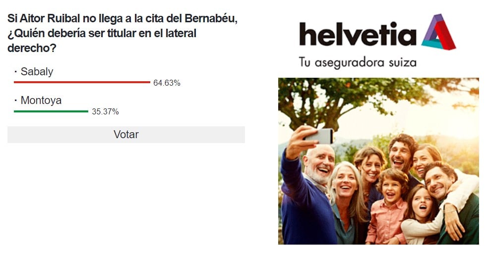 Por eso mismo hemos preguntado en nuestra #EncuestaHelvetiaED sobre quién debería ser el sustituto de Aitor Ruibal si finalmente las molestias no remiten o si Manuel Pellegrini prefiere no forzar al futbolista pensando en el cargado calendario que se avecina en las próximas fechas. Las opciones sólo son dos, Sabaly o Montoya. Y la afición parece tenerlo claro pues el senegalés Sabaly sería el elegido con un 64,63% de los votos para ser titular frente a los blancos en caso de no utilizar a Aitor Ruibal. Por el contrario, un 35,37% de los participantes apostaría por la presencia de Martín Montoya en el once titular, algo que, sin duda, sería toda una sorpresa.