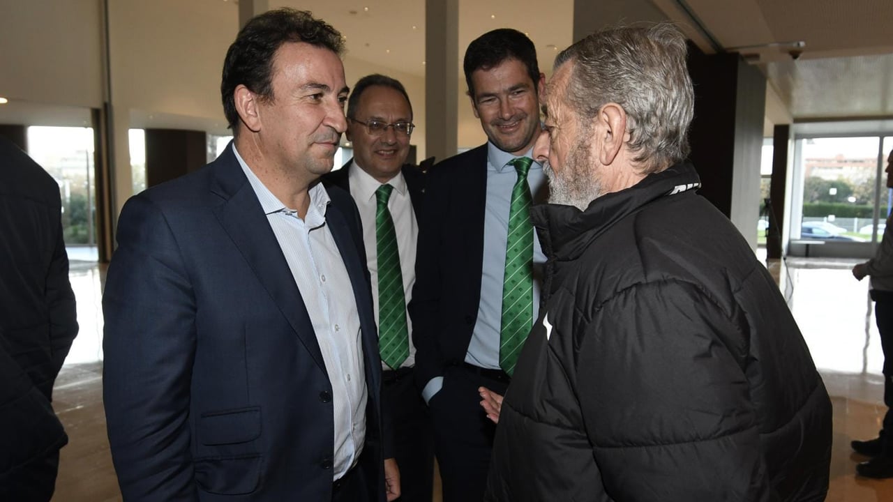 Ramón Alarcón (de frente) conversa con otros consejeros antes de la pasada Junta de Accionistas del Betis.Lince