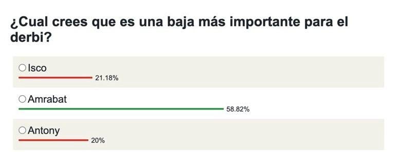 Entre tantas bajas, en ESTADIO hemos querido conocer el sentir de la afición bética con ellas y cuál es la que más cree que puede afectar al equipo en el Sánchez-Pizjuán. Los aficionados tienen clara su decisión y el perfil que más temen perder para este choque. El 58,82% de los votos creen que Amrabat es la peor baja de todas. El marroquí ha caído de pie en Heliópolis y su capacidad de recuperar balones y dar calma en el medio ha enamorado al beticismo. La opción de Isco y Antony le siguen de lejos con un 21,18% y un 20%, respectivamente.