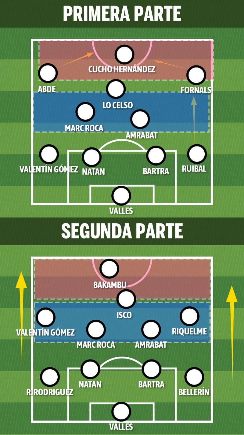 Tras el descanso, Pellegrini introdujo un cambio sorprendente, al entrar Bakambu por Cucho, el factor más desequilibrante en la primera parte, y también dejó en el banquillo a Lo Celso por Riquelme, que al contrario de lo habitual, partió desde la diestra. Por ende, Fornals pasó al centro.