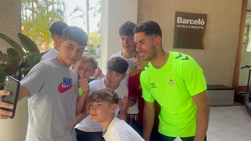 Los futbolistas del Real Betis fueron aclamados a su llegada al hotel de concentración en Marbella tras el entrenamiento. Ayoze recibió peticiones para permanecer en el club, mientras que el argentino se fotografió con el familiar de un sevillista allí presente