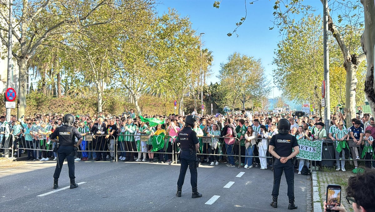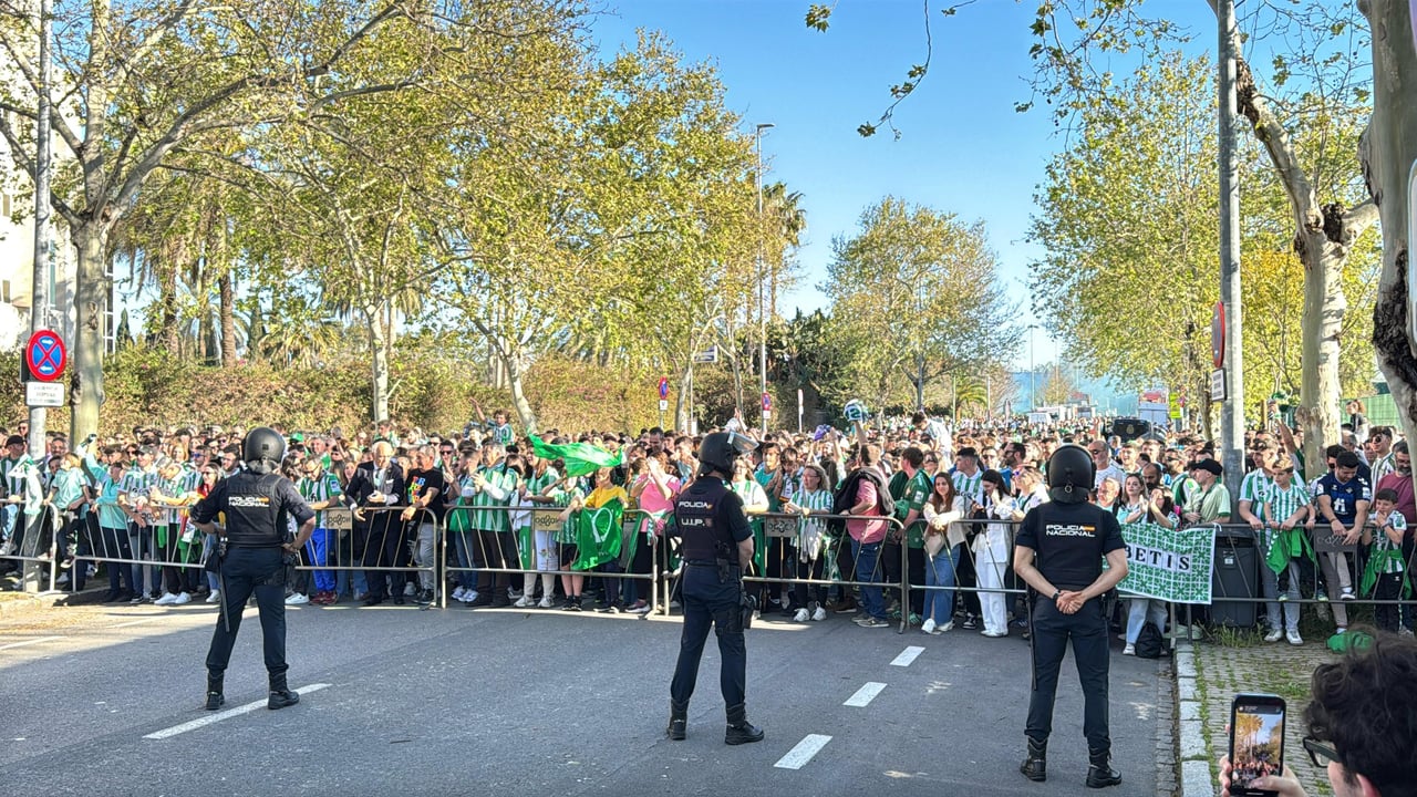Los miembros de la fuerza pública, controlando la llegada de los autobuses bético y sevillista.Lince