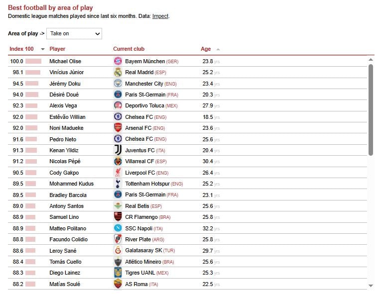 La tabla la lidera con una puntuación perfecta de 100 sobre 100 el francés Michael Olise, jugador del Bayern de Múnich que es el mejor del mundo en el uno contra uno. Le siguen el madridista Vinícius (98,1); Jeremy Doku, del Manchester City (94,5); Desire Deoue, del PSG (94); Alexis Vega, del Toluca (92,3); Estevao William, del Chelsea (92); Noni Madueke, del Arsenal (92); Pedro Neto, del Chelsea (91,6); Kenan Yildiz, de la Juventus (91,3); Nicolas Pepé, del Villarreal (91,2); Cody Gakpo, del Liverpool (90,5); Mohammed Kudus, del Tottenham (89,5); Bradley Barcola, del PSG (89,5); el propio Antony dos Santos (89) y Samu Lino, del Flamengo (88,9); además de otros 35 encaradores natos que completan la lista.
