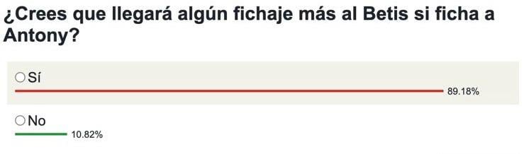 Por eso, en Estadio Deportivo hemos querido conocer la opinión de la afición bética, a menos de 48 horas para el final, sobre si creen que llegará alguien más al equipo de Pellegrini en el caso de que el carioca consiga su deseo de volver al Betis. La respuesta ha sido contundente y de absoluta confianza. El 89,18% de los votos confían en que Manu Fajardo y los suyos traigan a alguien más aparte del de Osasco. Tan sólo el 10,82% creen que sólo llegará Antony al Betis.