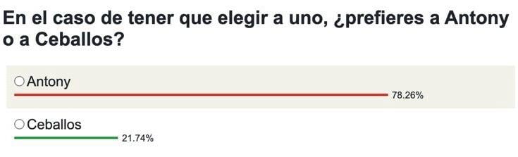 En Estadio Deportivo hemos querido preguntar a la afición del Real Betis sobre su preferencia a la hora de fichar a alguno de los dos futbolistas por separado. La respuesta del beticismo ha sido muy contundente. El 78,26% de los votos van dirigidos al extremo brasileño del United. Sólo el 21,74% preferiría a Dani Ceballos por delante del de Sao Paulo. Queda claro que los aficionados verdiblancos quieren cumplir el sueño de volver a ver al ya conocido como 'Antonio de Triana' en la banda del Estadio de la Cartuja con la elástica de las trece barras.