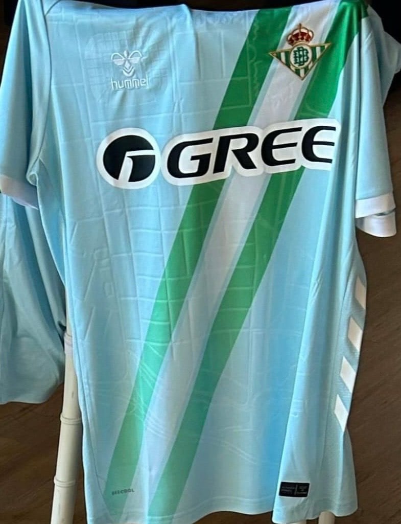 Dándole continuidad a la apuesta por el azul en la tercera equipación usada por el Betis en la 24/25, la marca danesa repite color en la indumentaria de los verdiblancos. Tal y como se puede ver en la imagen, el azul vuelve a ser protagonista, siendo el tono; eso sí, mucho más celeste que el utilizado la temporada pasada. Azul cielo con los colores principales del club en forma de franja atravesando el escudo.