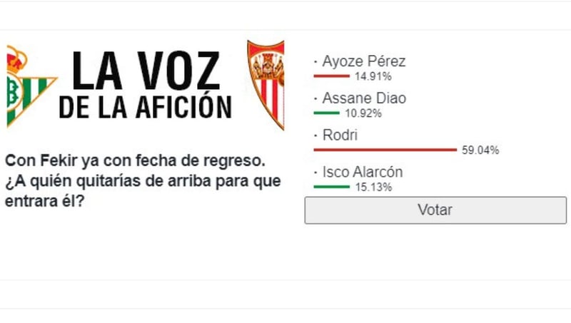 Ante esta duda, la afición tiene claro que, de los cuatro antes nombrados, Rodri sería el sacrificado, pero mantendrían a Assane Diao en el once por delante de Isco Alarcón y Ayoze Pérez. Así lo señalan en el #EncuestaHelvetia, donde refleja la disparidad de opiniones que hay sobre quién debe jugar y quién no.