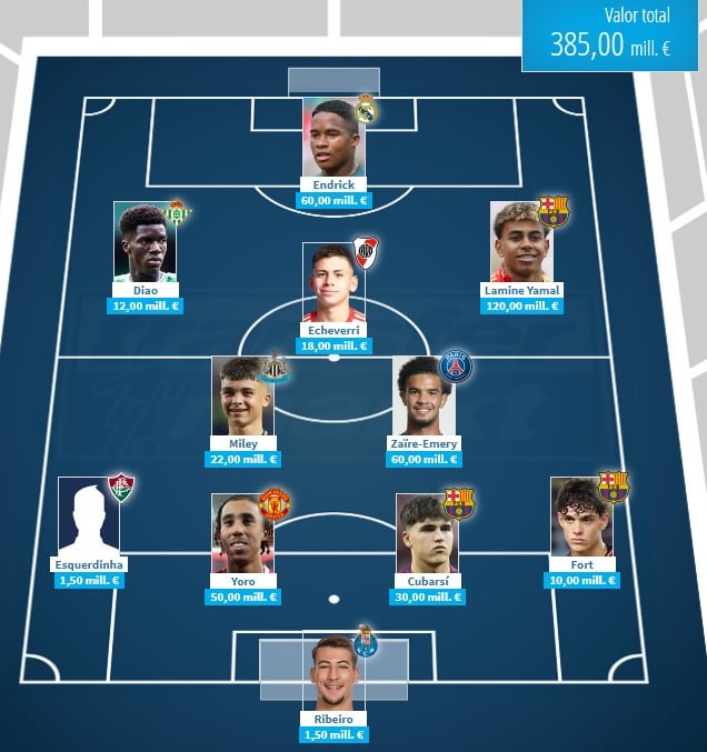 De este modo, ocuparía el flanco izquierdo de una formación que cuenta con futbolistas de la talla de Lamine Yamal, con un valor de 120.000 millones de euros y que ocuparía el otro costado, mientras que la punta de lanza corresponde al nuevo jugador madridista Endrick (60 millones). El centro del campo lo compone Zaire-Emery, del PSG, con una tasación de 60 kilos; Miley (Newcastle, 22 M) y Echeverri (River Plate, 18 M).
