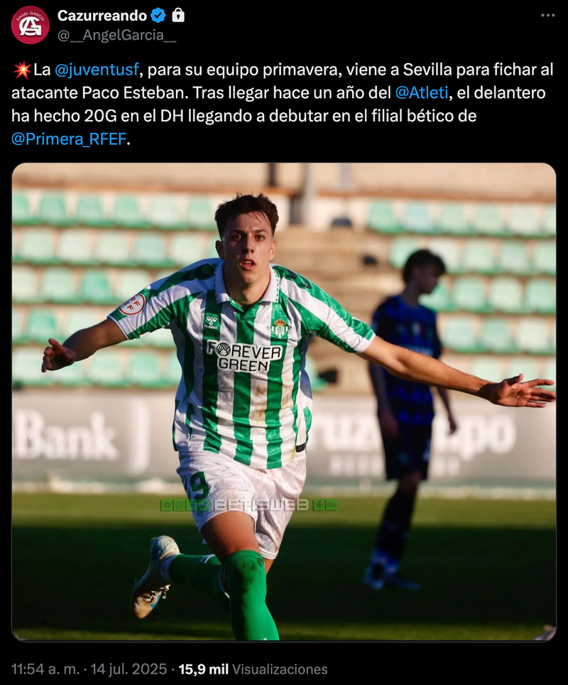 En otro orden de cosas, la Juventus viaja a Sevilla para llevarse a Paco Esteban, delantero también de 19 años que siguiera el mismo camino que Embalo, en este caso desde el Atlético de Madrid, sumando 20 goles en 41 partidos con la escuadra de División de Honor Juvenil entre todas las competiciones. Sorprendentemente ausente por decisión técnica en Ponferrada para la disputa de las semifinales y la final del principal trofeo nacional, tiene dos años más de contrato con el conjunto heliopolitano, según algunas fuentes prorrogable hasta 2030, por lo que los 'bianconeri' deberán pasar por caja o proponer a sus homólogos andaluces una fórmula que, a corto-medio plazo, permita monetizar el adiós anticipado del atacante. El movimiento ha sido avanzado por Ángel García en 'Cazurreando.com'.