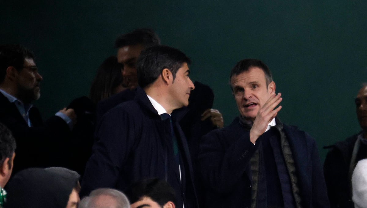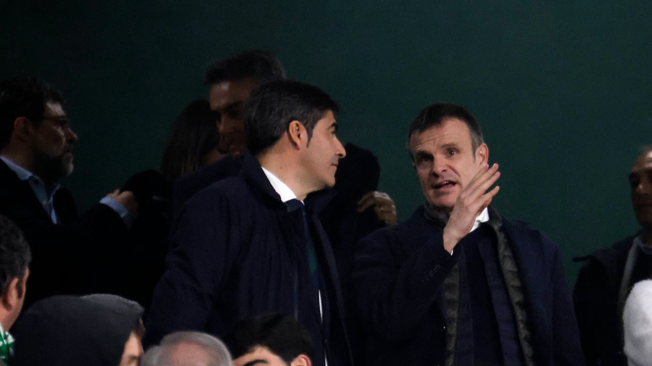 Ángel Haro y Jon Uriarte conversan en el palco del Benito Villamarín, antes del duelo de este pasado domingo.Cordon Press