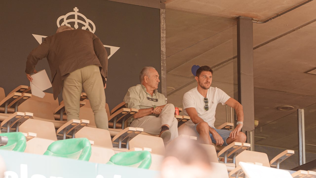 Gordillo y Joaquín observan desde la grada el primer entrenamiento del Betis en La Cartuja.Lince
