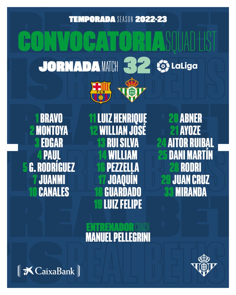 La lista completa, con los 22 futbolistas del Betis que Pellegrini se lleva a Barcelona es la siguiente: Claudio Bravo, Rui Silva, Dani Martín; Aitor Ruibal, Martín Montoya, Edgar González, Germán Pezzella, Luiz Felipe Ramos, Abner Vinicius, Juan Miranda; Paul Akouokou, Guido Rodríguez, William Carvalho, Andrés Guardado, Sergio Canales, Rodri Sánchez, Joaquín Sánchez, Luiz Henrique, Juan Cruz; Juanmi Jiménez, Ayoze Pérez y Willian José.