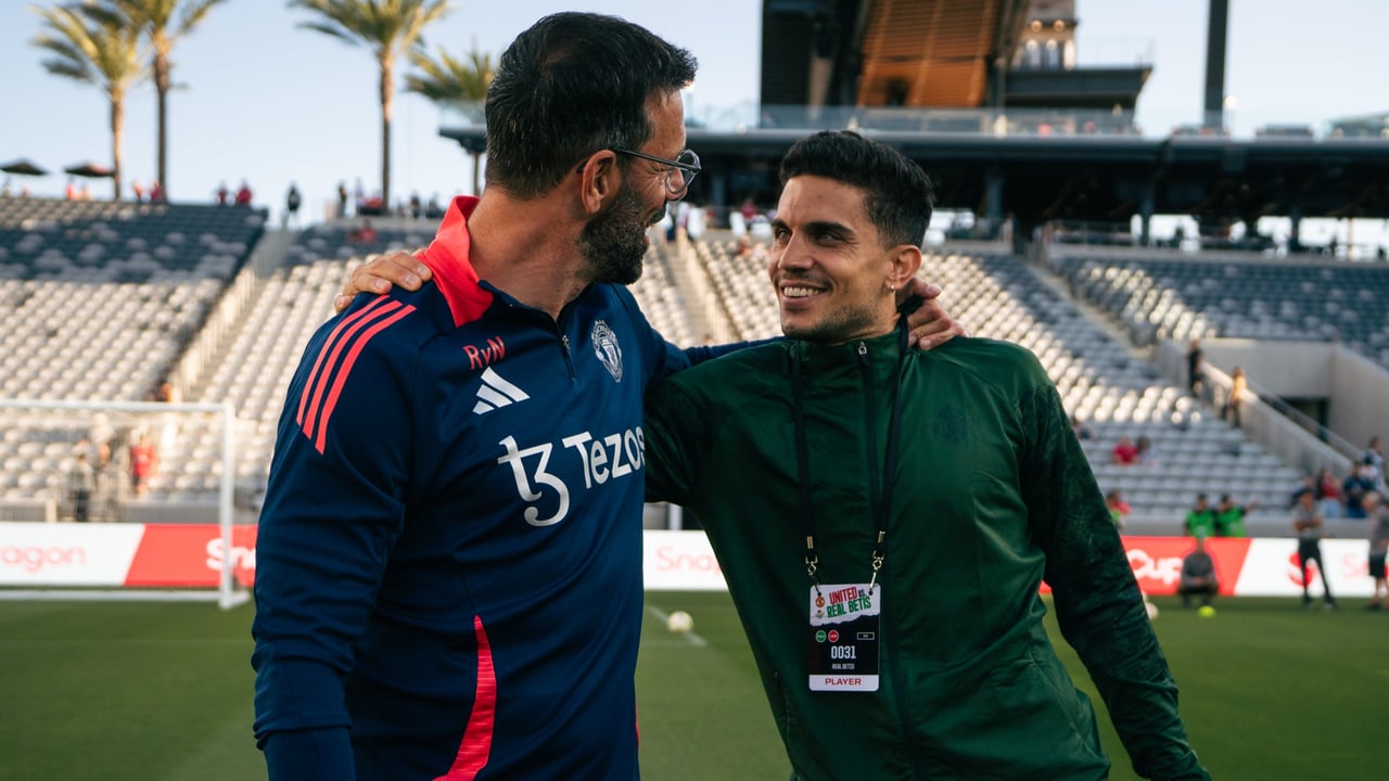 El zaguero saluda a Ruud van Nistelrooy antes del duelo en San Diego.RBB
