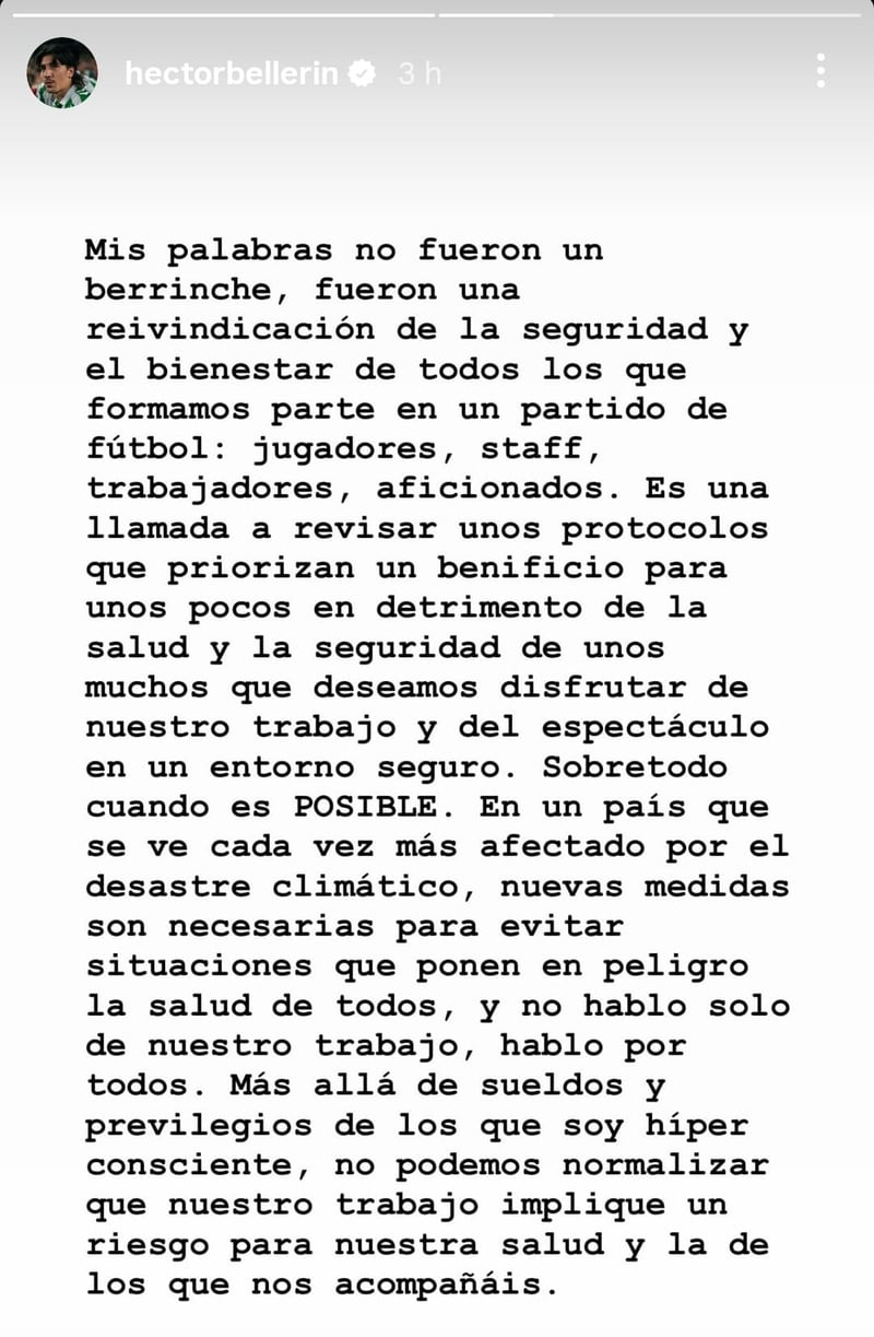 "Mis palabras no fueron un berrinche, fueron una reivindicación de la seguridad y el bienestar de todos los que formamos parte en un partido de fútbol: jugadores, 'staff', trabajadores, aficionados... Es una llamada a revisar unos protocolos que priorizan un beneficio para unos pocos en detrimento de la salud y la seguridad de unos muchos que deseamos disfrutar de nuestro trabajo y del espectáculo en un entorno seguro. Sobre todo cuando es posible", ha puntualizado Bellerín en un comunicado compartido a través de sus perfiles en redes sociales.