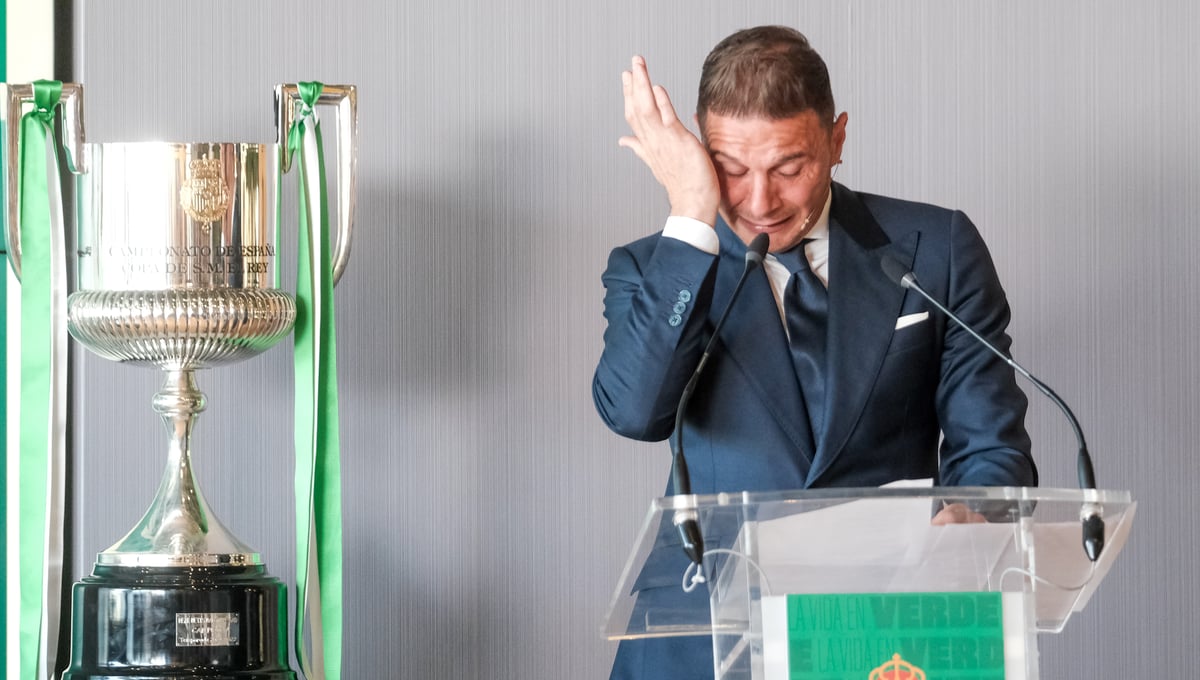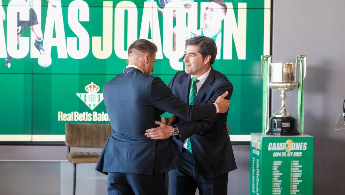 "Ayer anunció su decisión de retirarse y este acto de hoy es sólo un pequeño homenaje para mostrarte nuestro cariño, pero el verdadero homenaje será un partido en tu honor que celebraremos a final de temporada, en una gran fiesta para los béticos. Antes, quedan nueve partidos muy importantes en los que esperamos que disfrutes y que nos ayudes, como siempre, a llegar a lo más arriba posible. Muchas gracias por todo lo que has dado al Betis desde que llegaste desde el Puerto de Santa María siendo un niño. Muchas gracias por ser Joaquín el del Betis", le decía Haro a un Joaquín que no podía contener las lágrimas.