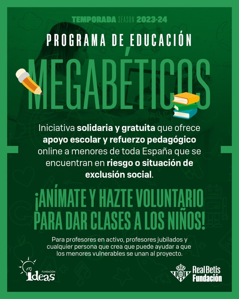 Una forma más de hacer Betis. El Real Betis y la Fundación Ideas están en búsqueda de 'megabéticos' que quieran ayudar a aquellos que necesiten este apoyo escolar. En concreto, se busca a jóvenes estudiantes -muchos de los voluntarios realizarán sus prácticas universitarias en el proyecto Megabéticos-, profesores en activo, jubilados y a cualquier persona que crea que pueda ayudar en el apoyo escolar online.