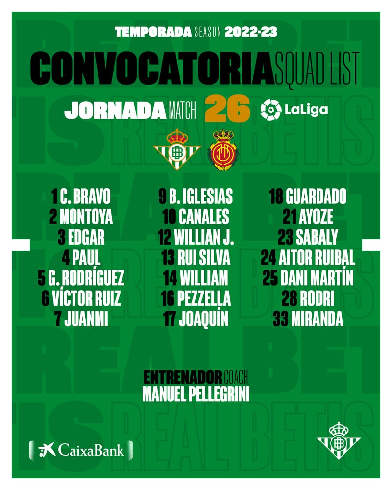 La lista completa de 21 convocados por Pellegrini para el Betis-Mallorca de la jornada 26 de LaLiga en Primera división es la siguiente: Bravo, Montoya, Edgar, Paul, Guido Rodríguez, Víctor Ruiz, Juanmi, Borja Iglesias, Canales, Willian José, Rui Silva, William Carvalho, Pezzella, Joaquín, Guardado, Ayoze, Sabaly, Aitor Ruibal, Dani Martín, Rodri y Miranda.
