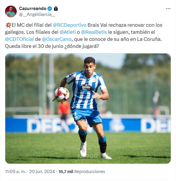 Según el periodista Ángel García (Cazurreando.com), el Betis ha puesto sus ojos en Brais Val, mediocentro defensivo del Deportivo de La Coruña que ha sido pieza básica en su filial, el Fabril, en la 23/24, en la que ha disputado 33 encuentros en Segunda RFEF, llamando también la atención del Atlético de Madrid, igualmente para su segundo equipo. A ellos se suma también el Tenerife de Óscar Cano, que lo conoce de primera mano de su paso por el conjunto gallego.