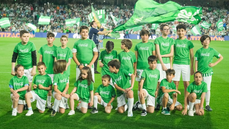 Uniformados con la equipación del Real Betis, superpusieron una camiseta verde de Coca-Cola, entidad que trabaja mano a mano con los verdiblancos y que antepone la felicidad de los jóvenes béticos, tal y como reflejan escenas como esta.