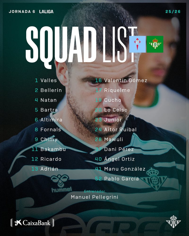 Así las cosas, la lista al completo, con los 21 futbolistas convocados por Pellegrini para el choque de este miércoles en Balaídos es la compuesta por Álvaro Valles, Héctor Bellerín, Natan de Souza, Marc Bartra, Sergi Altimira, Pablo Fornals, Chimy Ávila, Cédric Bakambu, Ricardo Rodríguez, Adrián San Miguel, Valentín Gómez, Rodrigo Riquelme, Cucho Hernández, Giovani Lo Celso, Junior Firpo, Aitor Ruibal, Mawuli Mensah, Dani Pérez, Ángel Ortiz, Manu González y Pablo García.