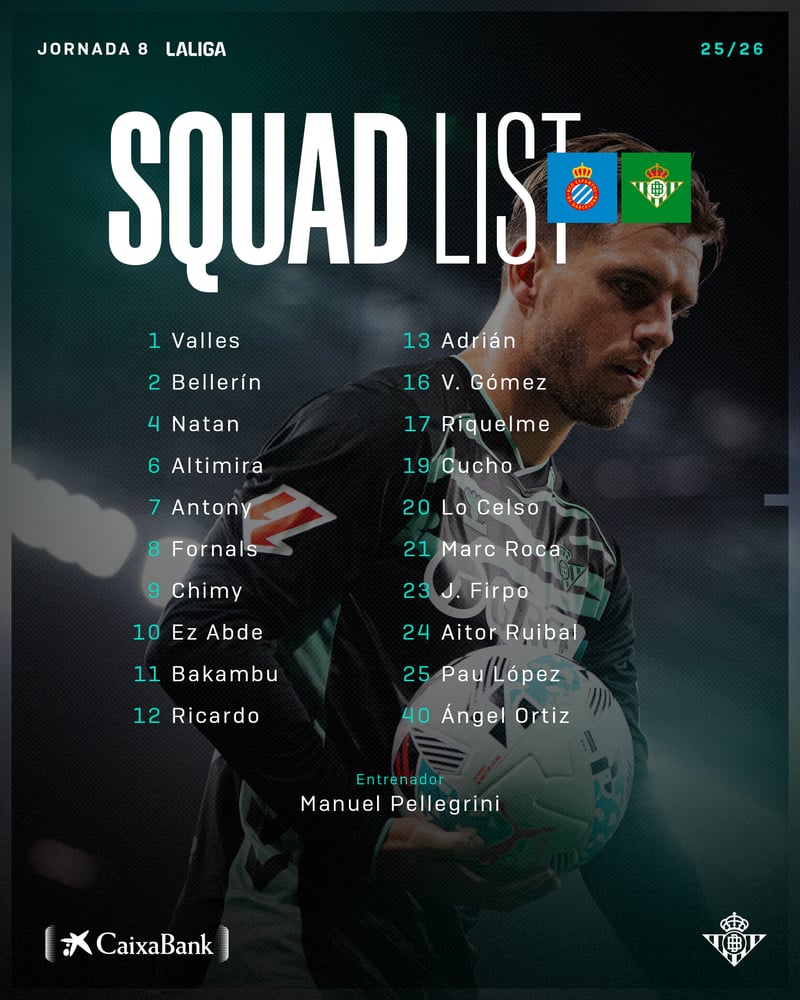 Así las cosas, el Real Betis no ha podido repetir convocatoria por tercer encuentro consecutivo y la expedición se recorta a sólo 20 futbolistas. La lista de citados por Pellegrini para visitar al RCD Espanyol está formada por los porteros Adrián San Miguel, Pau López y Álvaro Valles; los defensas Héctor Bellerín, Ángel Ortiz, Aitor Ruibal, Natan de Souza, Valentín Gómez, Ricardo Rodríguez y Junior Firpo; los centrocampistas Marc Roca, Sergi Altimira, Pablo Fornals y Giovani Lo Celso; y los atacantes Antony dos Santos, Rodrigo Riquelme, Ez Abde, Chimy Ávila, Cucho Hernández y Cédric Bakambu. Llama la atención la ausencia de jugadores del Betis Deportivo, que este mismo sábado por la mañana se enfrentaba al Algeciras CF en un choque correspondiente a la jornada 6 de liga en el Grupo 2 de la Primera RFEF y disputado en la Ciudad Deportiva Luis del Sol.
