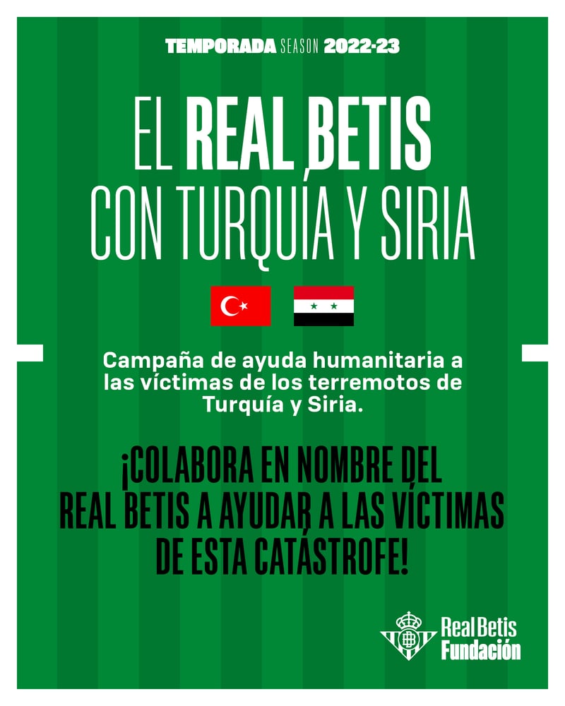La Fundación del Real Betis ha lanzado una campaña de ayuda humanitaria a las víctimas del terremoto de Turquía y Siria, sumándose de esta manera a la iniciativa de 'Cada Minuto Cuenta' lanzada por LaLiga. La entidad verdiblanca pide a sus aficionados su colaboración con la donación de 3 euros para ayudar en nombre del club heliopolitano a los damnificados de esta catástrofe. Esta petición se ha realizado mediante SMS a los más de 75.000 socios de la institución, que podrán enviar su donativo hasta el próximo 23 de febrero a las 22:00 horas. Todo el dinero recaudado será destinado por parte de la Fundación RBB a la cuenta habilitada por el Comité de Emergencia integrado por seis ONG´s que se encuentran trabajando en las zonas afectadas: Aldeas Infantiles SOS, Educo, Oxfam Intermon, Médicos del Mundo, Plan Internacional y World Vision. Todos aquéllos que sean simpatizantes del Real Betis y no hayan recibido este mensaje, el club les anima a participar en la campaña a través de la página web comiteemergencia.org, donde se podrá igualmente realizar una donación de manera muy sencilla y rápida.