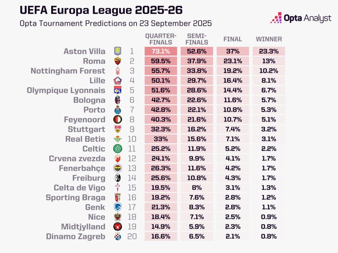 También ha lanzado sus predicciones la empresa 'Opta'. Según los cálculos matemáticos de su base de datos, el pase del Betis a octavos de final se da prácticamente por hecho y hay un 33% de posibilidades de alcanzar el exigido listón de los cuartos de final. Para disputar sus primeras semifinales de la UEFA Europa League rebajan las expectativas a un 15,6%, con un 7,1% para ser finalista y un 3,1% de llevar a las vitrinas el que sería su primer entorchado continental.