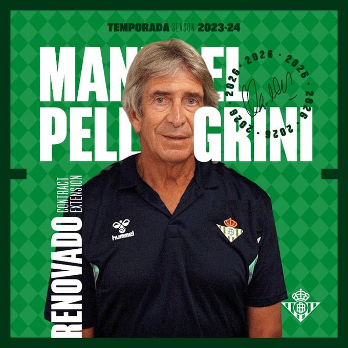 "El Real Betis Balompié y Manuel Pellegrini han renovado su vinculación para una temporada más. De esta manera, el entrenador chileno dirigirá al equipo verdiblanco hasta junio de 2026. Manuel Pellegrini llegó a la disciplina bética en verano de 2020. Bajo su mando, el Real Betis consiguió ganar la Copa del Rey en 2022. Además, el equipo se ha clasificado tres temporadas consecutivas para disputar competiciones europeas. Un hito sin precedentes en el club. Desde su llegada, Pellegrini se ha convertido en el tercer entrenador con más partidos al frente del equipo en Primera División y el segundo con más victorias. Con el entrenador chileno, el equipo juega un fútbol vistoso, ofensivo y con un sello de identidad muy marcado, con una importante presencia de los jugadores de la cantera", destaca la entidad en su comunicado.