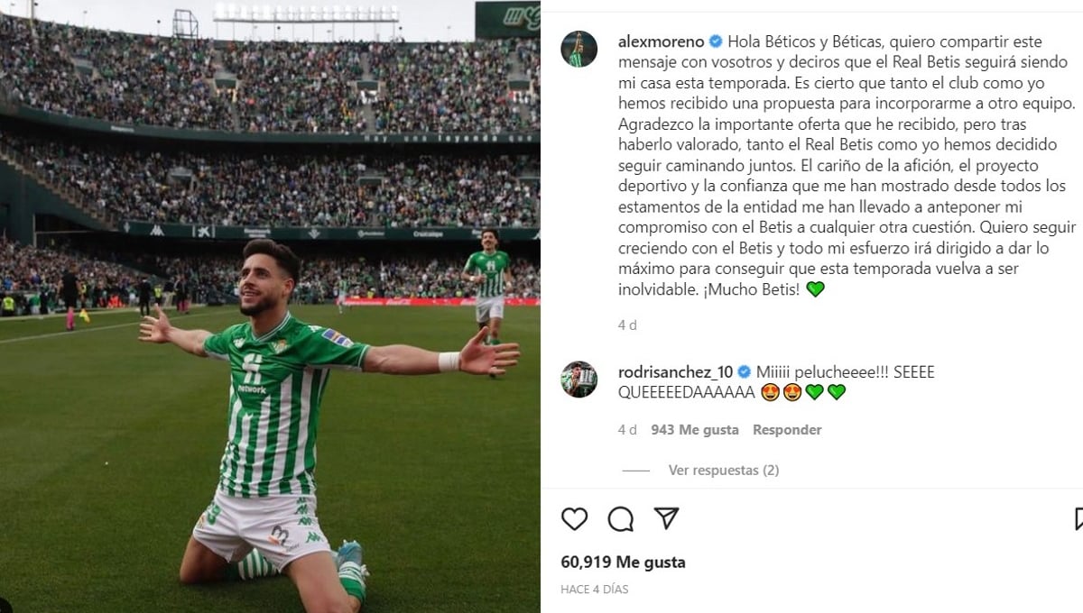 Con todo arreglado, el lateral catalán se lo pensó y, con una carta al beticismo llena de sentimiento, dijo que se quedaba. Sin embargo, los Tricky Trees no se han rendido. Están buscando alternativas (Emerson Palmieri, Estupiñán...), pero le han comunicado al agente del jugador, Pini Zahavi, que estaban estudiando llegar a lo que pedía el Betis y mejorar aún más la oferta al propio Alex Moreno para intentar que cambie de idea.