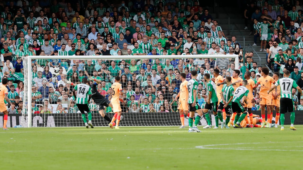 Jan Oblak no puede hacer nada por evitar que el libre directo de Fekir vaya dentro.UES