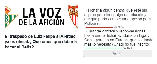 Ese es el debate en la dirección deportiva y también en la afición del Betis, que no pone pegas a la operación desde el punto de vista económica, pero que preocupa desde el prisma deportivo, pues Luiz Felipe era un hombre capital para Pellegrini. Y por ello, hemos querido pulsar la opinión del beticismo en nuestra #EncuestaHelvetiaED para saber cómo respira en este asunto. A la pregunta de ¿qué debería hacer el Betis tras la venta de Luiz Felipe? El beticismo se ha expresado.