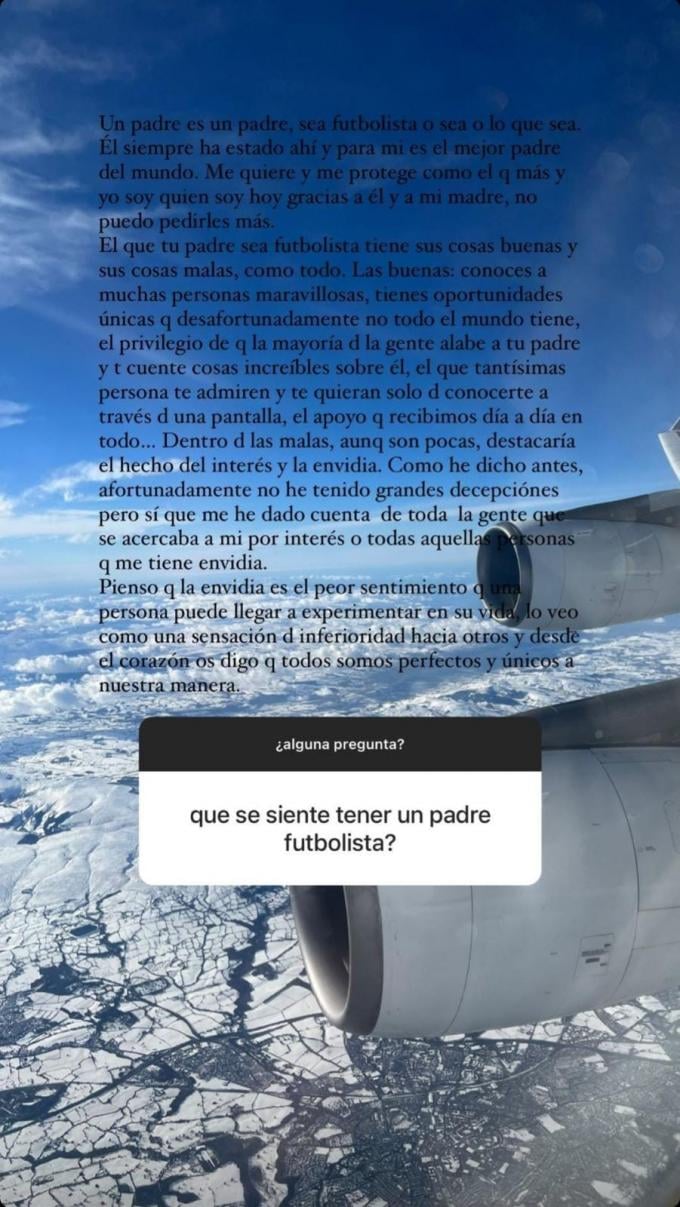 "Un padre es un padre, sea futbolista o sea lo que sea. Él siempre ha estado ahí y para mí es el mejor padre del mundo. Me quiere y me protege como el que más. Yo soy quien soy hoy gracias a él y a mi madre, no puedo pedirles más. Que tu padre sea futbolista tiene cosas buenas y sus cosas malas, como todo.Las buenas: conoces a muchas personas maravillosas, tienes oportunidades únicas que desafortunadamente no todo el mundo tiene, el privilegio de que la mayoría de la gente alabe a tu padre y te cuente cosas increíbles sobre él. También que tantísimas personas te admiren y te quieran solo de conocerte a través de una pantalla, el apoyo que recibimos día a día en todo...