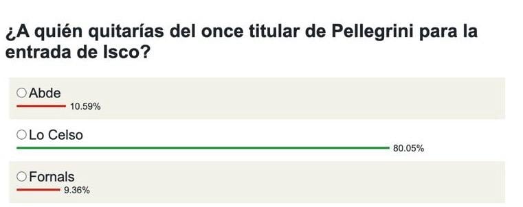 En Estadio Deportivo hemos querido preguntar a la afición del Betis por la opción que prefieren de cara a esa vuelta de Isco al esquema verdiblanco y los aficionados tienen clara su elección. El 80,05% de los votos quitarían a Lo Celso del once titular para dar entrada a Isco. Las otras opciones se han saldado con un 10,59% para Abde y un 9,36% para Fornals. No sabemos si Pellegrini lo tendrá tan claro, pero la afición verdiblanca tiene muy pocas dudas a día de hoy.