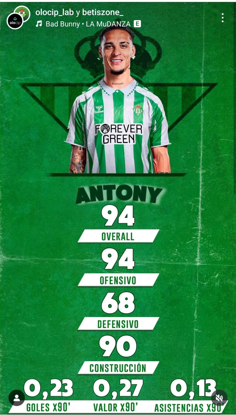 Antony es un futbolista de sobrada calidad técnica y con sólo 24 años que afronta esta cesión como una gran oportunidad de limpiar su mente, recuperar confianza y relanzar una carrera estancada después de la presión a la que fue sometido con los 100 millones de euros que el United pagó al Ajax cuando el paulista sólo tenía 22 años y apenas llevaba tiempo jugando en Europa. Hay una gran expectación por ver cómo rinde con la camiseta de las trece barras y la Inteligencia Artificial de Olocip ha dado algunas pistas de lo que pueden esperar los aficionados bétricos.