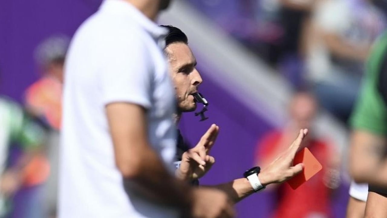 Del Cerro Grande, con la tarjeta roja en la mano para echar a Pezzella.LaLiga