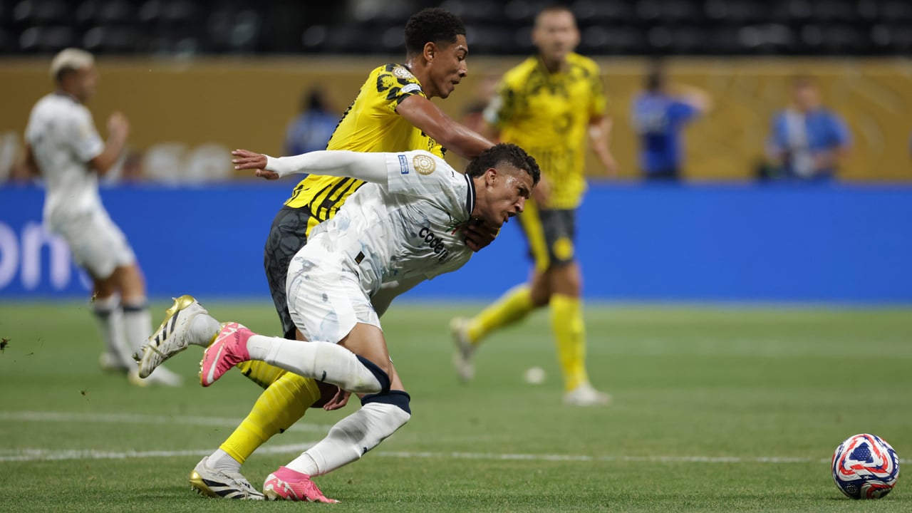 Jobe Bellingham presiona al 'cafetero' durante el Borussia Dortmund-Rayados del Mundial de Clubes.CORDON PRESS