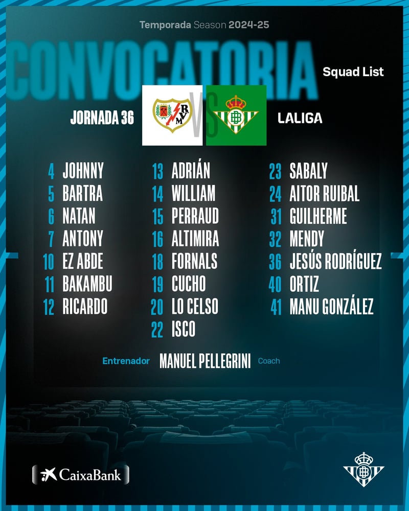 Así las cosas, la lista al completo con los 22 jugadores convocados por Pellegrini para el Rayo Vallecano - Real Betis de la tarde de este jueves (19:00 horas) es la compuesta por los porteros Adrián San Miguel, Guilherme Fernandes y Manu González; los defensas Aitor Ruibal, Youssouf Sabaly, Ángel Ortiz, Marc Bartra, Natan de Souza, Nobel Mendy, Ricardo Rodríguez y Romain Perraud; los centrocampistas Johnny Cardoso, Sergi Altimira, William Carvalho, Pablo Fornals, Giovani Lo Celso e Isco Alarcón; y los atacantes Antony Matheus dos Santos, Ez Abde, Jesús Rodríguez, Cédric Bakambu y el 'Cucho' Hernández.