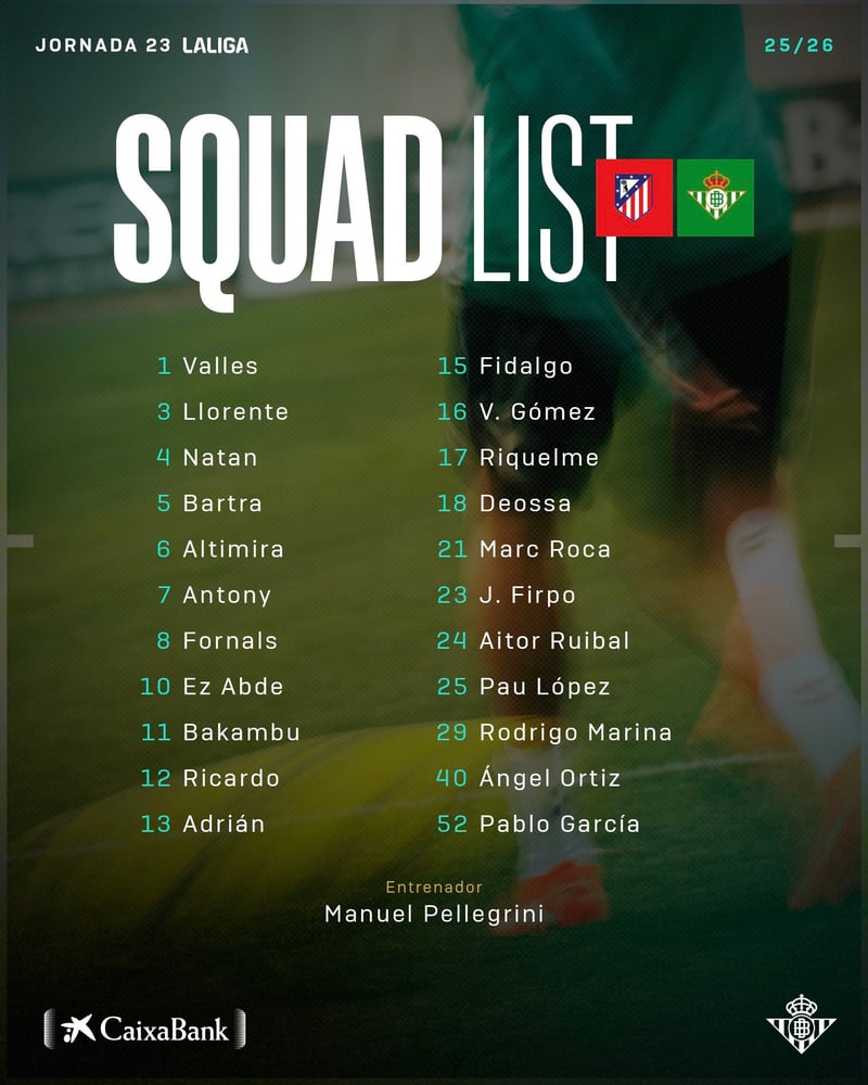Así las cosas, el listado al completo con los 22 futbolistas convocados por Manuel Pellegrini para el choque de la jornada 23 de LaLiga que Atlético de Madrid y Real Betis disputarán a partir de las 18:30 horas de este domingo está compuesta por los porteros: Álvaro Valles, Adrián San Miguel y Pau López; los defensas Ángel Ortiz, Aitor Ruibal, Marc Bartra, Diego Llorente, Natan de Souza, Valentín Gómez, Ricardo Rodríguez y Junior Firpo; los centrocampistas Sergi Altimira, Marc Roca, Nelson Deossa y Pablo Fornals; y los atacantes Antony dos Santos, Ez Abde, Rodrigo Riquelme, Pablo García, Rodrigo Marina y Cédric Bakambu.