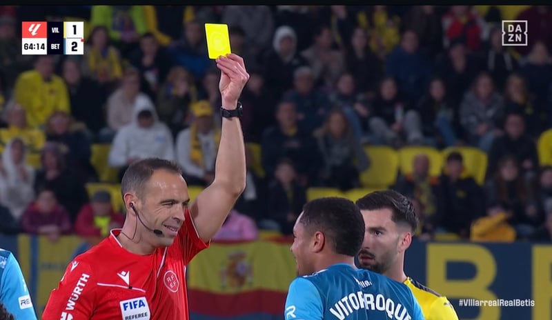 Lejos de enmendar su clamoroso error, que por fortuna no impidió la trabajada e importante victoria de los heliopolitanos en tierras castellonenses, el trencilla lo empeoró mostrando tres amonestaciones por recriminárselo y pedirle que lo viera de nuevo a Manuel Pellegrini, Giovani Lo Celso y Cédric Bakambu, como luego a Aitor Ruibal con un manotazo sin castigo a Diego Llorente. Cero mano izquierda del de Hortaleza, que, encima, pareció mofarse cuando regaló una sonrisa a Vitor Roque al enseñarle otra tarjeta posteriormente por cortar una contra de su anfitrión. A la espera de una posible 'nevera', Cuadra Fernández tampoco estuvo especialmente fino en la redacción del acta, contra la que a buen seguro se presentarán alegaciones en los próximos días para conseguir que el 'Chimy', que estaba y seguiría apercibido de sanción, pueda jugar el domingo contra el Rayo Vallecano.