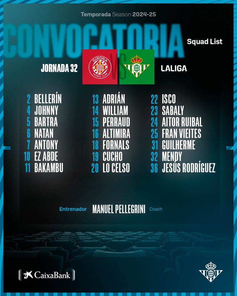 Así las cosas, la lista completa con los 21 futbolistas convocados por Pellegrini para el Girona - Betis de este lunes es la compuesta por Héctor Bellerín, Johnny Cardoso, Marc Bartra, Natan de Souza, Antony M. dos Santos, Ez Abde, Cédric Bakambu, Adrián San Miguel, William Carvalho, Romain Perraud, Sergi Altimira, Pablo Fornals, Cucho Hernández, Giovani Lo Celso, Isco Alarcón, Youssouf Sabaly, Aitor Ruibal, Fran Vieites, Guilherme Fernandes, Nobel Mendy y Jesús Rodríguez.
