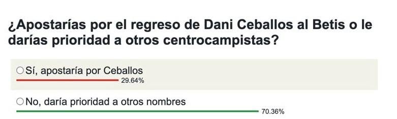 En Estadio Deportivo hemos querido preguntar a nuestros lectores en nuestra encuesta Helvetia por su preferencia para esa posición. Y la respuesta de los votantes ha sido bastante clara. Con un arrasador 70,36%, los aficionados béticos prefieren centrarse en otras opciones para el centro del campo y cerrar el culebrón de todos los veranos. Sólo el 29,64% le darían prioridad al regreso del canterano verdiblanco a la entidad heliopolitana.