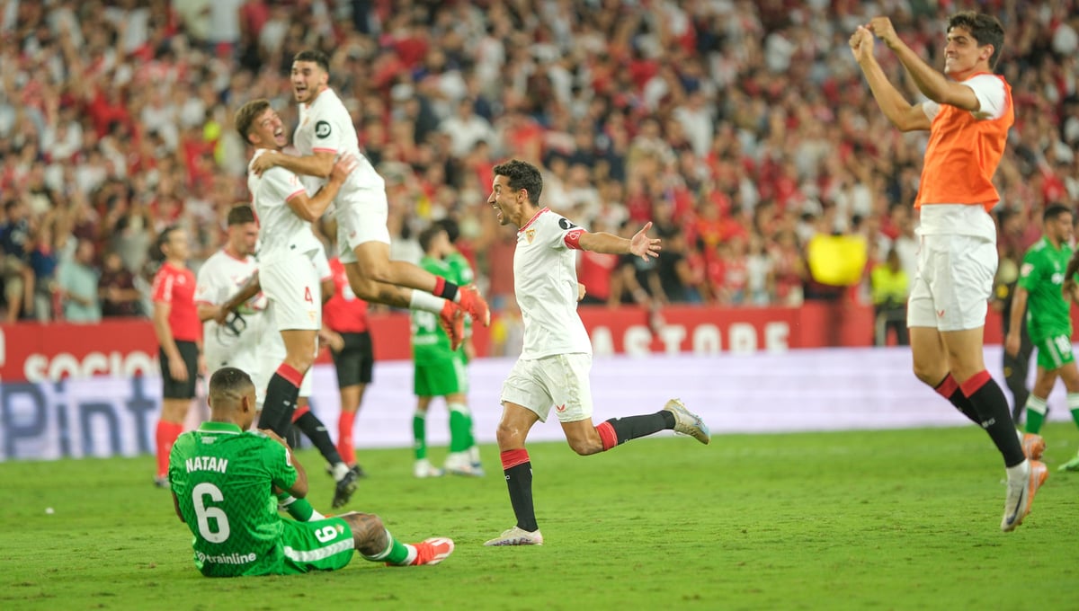 Navas celebra con euforia la victoria en su último derbi, con varios canteranos exhibiendo su alegría antes de coger la famosa banderita.Lince