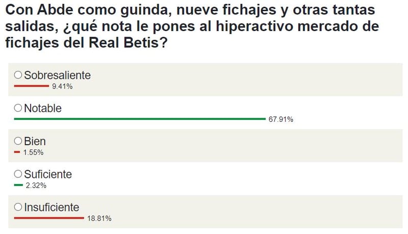 En este sentido, ESTADIO Deportivo pulsó la opinión de sus lectores béticos para ponerle nota al primer mercado de fichajes con Planes como arquitecto del Betis. El resultado en la #EncuestaHelvetiaED es contundente: merece un notable. Esta ha sido la opción marcada por un mayoritario 67,9 por ciento de los participantes en el sondeo, que refleja un considerable 9,4 por ciento que elevan la calificación a sobresaliente.