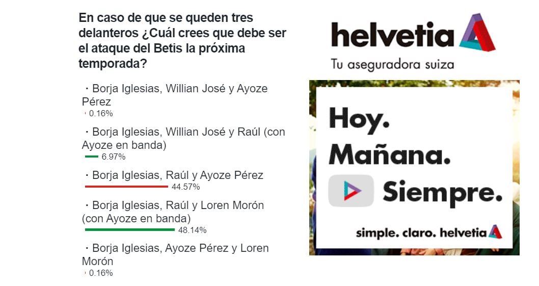 En medio de todas estas situaciones cruzadas, ESTADIO Deportivo ha pulsado la opinión del beticismo acerca de la delantera ideal para el Real Betis 2023/2024 proponiendo en la #EncuestaHelvetiaED cinco combinaciones posibles. De todas ellas, la opción más votada ha sido la que apuesta por mantener a Borja Iglesias, quedarse en propiedad con Ayoze Pérez y repescar a Raúl y Loren, que ha recibido un apoyo del 48 por ciento de los votantes. Le sigue de cerca, con un 44,2 %, la tripleta formada por Borja, Ayoze y Raúl (sin Loren) y no pasan del 7 % las opciones que incluyen a Willian José.