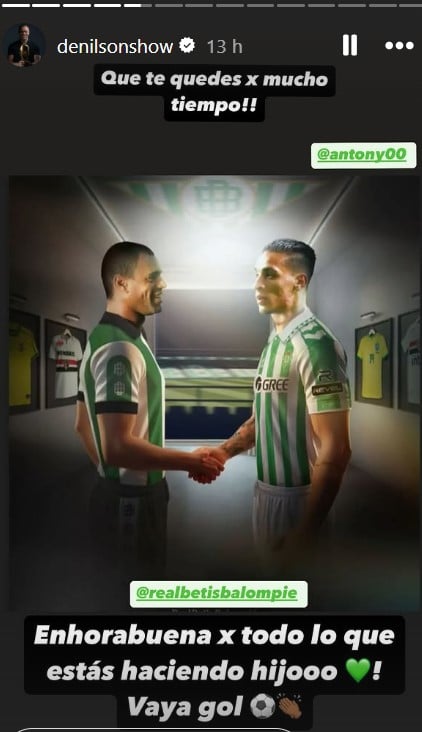 "Enhorabuena por todo lo que estás haciendo hijooo. ¡Vaya Gol!", escribió de Denilson en una curiosa story en la que aparecen Antony y él dibujados estrechándose la mano vestidos del Betis.