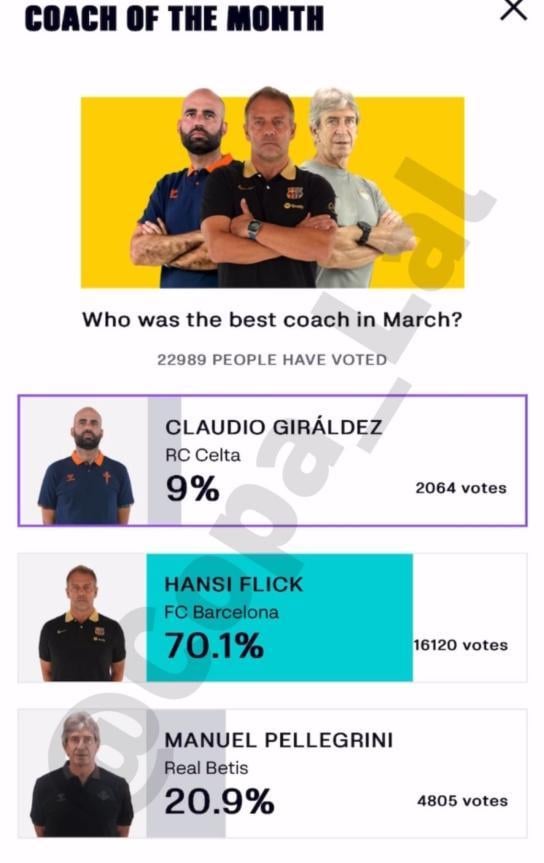 Tiene entre cero y nada de importancia, pues se trata de un reconocimiento que otorga LaLiga a los jugadores y entrenadores de Primera división cada mes, señalando igualmente cuál ha sido el mejor gol, qué parada ha sobresalido entre las demás y qué sub 23 ha destacado especialmente. El caso es que, cuando este lunes se declaró a Manuel Pellegrini como el mejor técnico de marzo, se reflejaba en la nota de ESTADIO Deportivo el necesario 'sorpasso' en las votaciones de los seguidores de la patronal de los clubes en redes sociales, puesto que, a pocas horas de que se abrochase el cómputo, la ventaja de Hansi Flick sobre el 'Ingeniero' y Claudio Giráldez era muy importante. No andaban ni mucho menos igualados, puesto que, con el míster del RC Celta de Vigo más rezagado (en torno al 9% de los 'sufragios'), el chileno estaba unos 50 puntos por debajo.